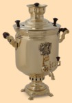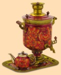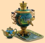 В комплекте комбинированный самовар (растапливается с помощью дров или электричества), заварочный чайник и поднос