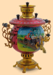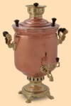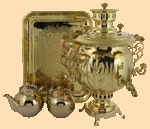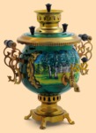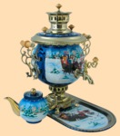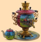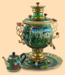 В комплекте комбинированный самовар (растапливается с помощью дров или электричества), заварочный чайник и поднос