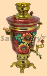 Самовар: - объем 4 литра - высота самовара 43 см - ширина самовара по ручки 30 см - материал: латунь - расписан вручную, покрыт лаком - мощность ТЭНа 1 кВт, время закипания 18-20 минут - вес самовара 2,6 кг Производитель Россия (Тула)
