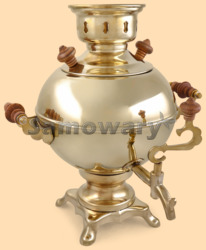 Самовар: - объем 3 литра - высота самовара 36 см - ширина самовара по ручки 31 см - материал: полированная латунь (жёлтый цвет) - ручки выполнены из дерева и покрашены коричневой морилкой - мощность ТЭНа 1 кВт, время закипания 15-20 минут - вес самовара 2,4 кг - производитель Тула