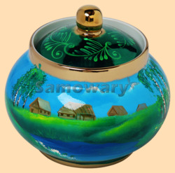 Высота сахарницы 13 см, диаметр 9 см Диаметр горлышка 7,5 см, диаметр отверстия 6,5 см Объём 500 мл Вес 450 гр. Материал керамика Ручная авторская роспись Производитель Россия