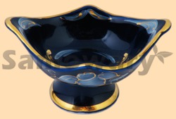 "Глухой кобальт" - это особый вид росписи, когда блестящая темно-синяя глазурь покрывает все изделие, а по ней наносится тонкий, графичный рисунок золотом. Также, в процессе росписи может быть использована белая надглазурная краска, отчего она становится как бы зеркальным отражением традиционной гжельской техники, когда синие цветы превращаются в белые, а белый фон становится синим, создавая эффект морозного узора. К сожалению, на фотографиях очень сложно передать всю глубину цвета кобальтовой глазури и богатство росписи. Однако, достаточно просто взять в руки такое изделие, чтобы навсегда влюбиться в него.