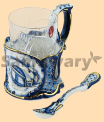 В комплекте подстаканник, хрустальный стакан, керамическая ложка