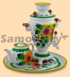 В комплекте заварочный чайник и поднос Самовар: - объем 1,5 литра - высота самовара 33 см - ширина самовара по ручки 24 см - материал: латунь - расписан вручную, покрыт лаком - мощность ТЭНа 1 кВт, время закипания 15 минут - вес самовара 2 кг Чайник: - объем чайника 700 мл - вес чайника 500 гр - материал: фарфор - расписан вручную, покрыт лаком Поднос: - размер 35 см - вес подноса 400 гр - форма подноса может отличаться от фото, возможные формы подносов - круг (диаметр 35 см), овал (34 на 46 см), прямоугольник (30 на 40 см), арка (23 на 40 см), ключ (31 на 41 см), более подробную информацию вам предоставит менеджер - производитель Тула