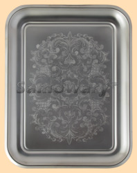 Размер подноса для самовара 31 на 41 см Внутренний размер подноса без бортиков 22 на 32 см Материал посеребрённая латунь На внутренней поверхности подноса нанесён узор методом холодной штамповки Вес посеребрённого подноса 1200 гр. Производитель Россия