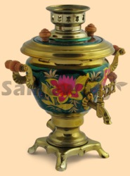 Самовар: - объем 2 литра - высота самовара 32 см - ширина самовара по ручки 30 см - материал: латунь - расписан вручную, покрыт лаком - мощность ТЭНа 1 кВт, время закипания 18-20 минут - вес самовара 2,3 кг - производитель Россия (Тула)