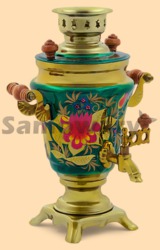 Самовар: - объем 1,5 литра - высота самовара 33 см - ширина самовара по ручки 24 см - материал: латунь - расписан вручную, покрыт лаком - мощность ТЭНа 1 кВт, время закипания 15 минут - вес самовара 2 кг - производитель Тула