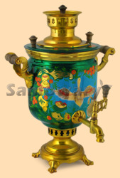 Самовар: - объем 5 литров - высота самовара 47 см - ширина самовара по ручки 36 см - материал: латунь - расписан вручную, покрыт лаком - растапливается с помощью дров или шишек - вес самовара 5 кг Производитель Тула