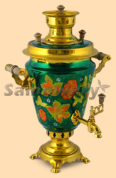 Самовар: - объем 5 литров - высота самовара 48 см - ширина самовара по ручки 36 см - материал: латунь - расписан вручную, покрыт лаком - растапливается с помощью дров или шишек - вес самовара 5 кг Производитель Тула