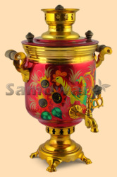 Самовар: - объем 5 литров - высота самовара 47 см - ширина самовара по ручки 36 см - материал: латунь - расписан вручную, покрыт лаком - растапливается с помощью дров или шишек - вес самовара 5 кг Производитель Тула