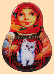 Каталог » Магниты » Магниты в форме матрёшки » Магнит матрёшка Девочка с котёнком в корзинке