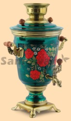 Самовар: - объем 4 литра - высота самовара 43 см - ширина самовара по ручки 30 см - материал: латунь - расписан вручную, покрыт лаком - мощность ТЭНа 1 кВт, время закипания 18-20 минут - вес самовара 2,6 кг Производитель Россия (Тула)