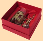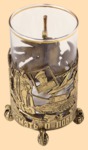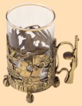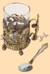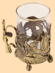 В комплекте подстаканник, ложка, стеклянный стакан, подарочная упаковка. Диаметр основания - 7,5 см, высота подстаканника (без стакана) - 9 см. Материал - латунь (литье) Покрытие - никель (чернение) Производитель Россия