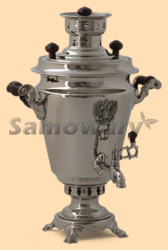 Самовар: - объем 5 литров - высота самовара 48 см - ширина самовара по ручки 36 см - материал: латунь, покрытая никелем (серебристый цвет) - покрытие не боится воды - на лицевой поверхности самовара размещён герб Российской Федерации, материал герба - латунь (никелированная) - растапливается с помощью дров или шишек - вес самовара 5 кг Производитель Тула