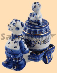 Каталог » Гжель » Солонки Гжель » Солонка Гжель Телега с мёдом (позолоченная)