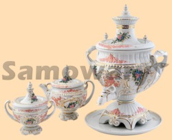 В комплекте: заварочный чайник, поднос, сахарница Самовар - - объем 4 литра - материал: фарфор - мощность ТЭНа 1 кВт Поднос - - диаметр 30 см - материал: фарфор Заварочный чайник - - объем 1 литр - материал: фарфор Сахарница - - объем 0,5 литра - материал: фарфор Производитель - Кисловодск