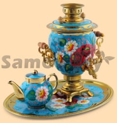 Каталог » Самовары ЭЛЕКТРИЧЕСКИЕ » Самовары электрические на 3л в наборе (расписные - цветы и ягоды) » Набор электрический Маки и ромашки на голубом (3л)
