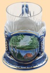 Каталог » Подстаканники » Подстаканники ГЖЕЛЬ с цветным рисунком » Подстаканник Гжель Домик у реки (позолочённый, в наборе)
