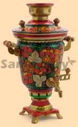 Самовар: - объем 4 литра - высота самовара 43 см - ширина самовара по ручки 30 см - материал: латунь - расписан вручную, покрыт лаком - мощность ТЭНа 1 кВт, время закипания 18-20 минут - вес самовара 2,6 кг Производитель Россия (Тула)