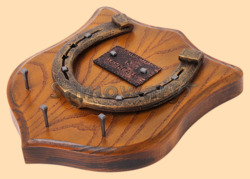 Размер медальона 19 на 22 см, с дополнительными подвесами чтобы вешать ключи (ключница) Медальон для подковы изготовлен из бука, покрашен под дуб и покрыт матовым лаком Размер подковы 13 на 13 см Подкова штампованная, покрыта патиной с медью Размер таблички 4 на 7 см Табличка кованная, покрыта патиной с медью Вес подковы - 900 гр. Производитель Россия