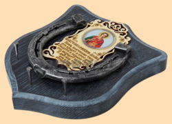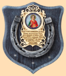 По центру подковы размещена деревянная табличка размером 8 на 13 см с ликом святого и молитвой на Благословение дома