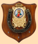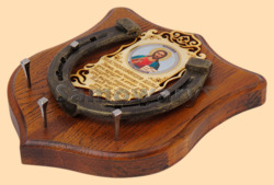 Размер медальона 19 на 22 см, с дополнительными подвесами чтобы вешать ключи (ключница) Медальон для подковы изготовлен из бука, покрашен под дуб и покрыт матовым лаком Размер подковы 13 на 13 см Подкова штампованная, покрыта патиной с золотом По центру подковы размещена деревянная табличка размером 8 на 13 см с ликом святого и молитвой на Благословение дома Вес подковы - 850 гр. Производитель Россия