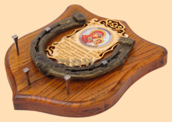 По центру подковы размещена деревянная табличка размером 8 на 13 см с ликом святого и молитвой на Благословение дома