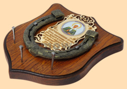 Размер медальона 19 на 22 см, с дополнительными подвесами чтобы вешать ключи (ключница) Медальон для подковы изготовлен из бука, покрашен под дуб и покрыт матовым лаком Размер подковы 13 на 13 см Подкова штампованная, покрыта патиной с золотом По центру подковы размещена деревянная табличка размером 8 на 13 см с ликом святого и молитвой на Благословение дома Вес подковы - 850 гр. Производитель Россия