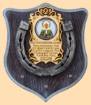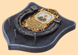 По центру подковы размещена деревянная табличка размером 8 на 13 см с ликом святого и молитвой на Благословение дома