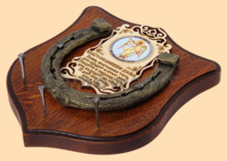 По центру подковы размещена деревянная табличка размером 8 на 13 см с ликом святого и молитвой на Благословение дома