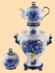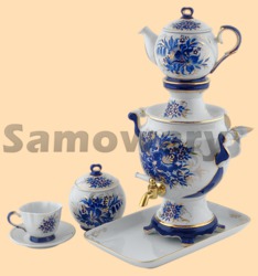 В комплекте: заварочный чайник, поднос, сахарница, 6 чашек с блюдцами Самовар - - объем 1 литр - материал: фарфор - мощность ТЭНа 1 кВт Производитель Россия (Кисловодск)
