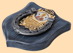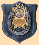 Размер медальона 19 на 22 см, с дополнительными подвесами чтобы вешать ключи (ключница) Медальон для подковы изготовлен из бука, покрашен под венге и покрыт матовым лаком Размер подковы 13 на 13 см Подкова штампованная, покрыта патиной с серебром По центру подковы размещена деревянная табличка размером 8 на 13 см с ликом святого и молитвой на Благословение дома Вес подковы - 850 гр. Производитель Россия