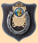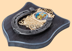 Размер медальона 19 на 22 см Медальон для подковы изготовлен из бука, покрашен под венге и покрыт матовым лаком Размер подковы 13 на 13 см Подкова штампованная, покрыта патиной с серебром По центру подковы размещена деревянная табличка размером 8 на 13 см с ликом святого и молитвой на Благословение дома Вес подковы - 850 гр. Производитель Россия