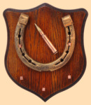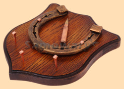 Размер медальона 19 на 22 см, с дополнительными подвесами чтобы вешать ключи (ключница) Медальон для подковы изготовлен из бука, покрашен под дуб и покрыт матовым лаком Размер подковы 13 на 13 см Подкова штампованная, покрыта патиной с медью В качестве декоративного элемента использован настоящий патрон (деактивированный) Длина патрона 8 см, гильза изготовлена из меди Вес подковы - 850 гр. Производитель Россия