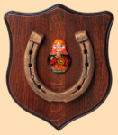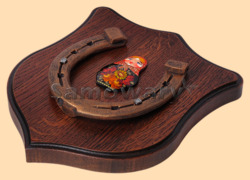 Размер медальона 19 на 22 см Медальон для подковы изготовлен из бука, покрашен под дуб и покрыт матовым лаком Размер подковы 13 на 13 см Подкова штампованная, покрыта патиной с медью По центру подковы прикреплена матрёшка, расписанная мастерами из Жостово Вес подковы - 850 гр. Производитель Россия
