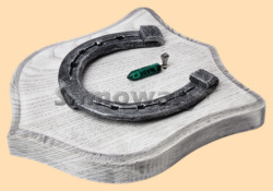 Размер медальона 19 на 22 см Медальон для подковы изготовлен из бука, покрашен под светлое дерево и покрыт матовым лаком Размер подковы 13 на 13 см Подкова штампованная, покрыта патиной с серебром В качестве декоративного элемента использована подвеска с малахитом Вес подковы - 850 гр. Производитель Россия