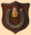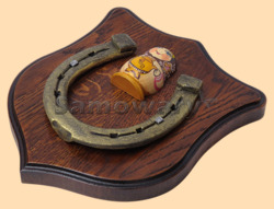 Размер медальона 19 на 22 см Медальон для подковы изготовлен из бука, покрашен под дуб и покрыт матовым лаком Размер подковы 13 на 13 см Подкова штампованная, покрыта патиной с золотом По центру подковы размещена декоративная накладка в виде матрёшки с традиционным русским народным сюжетом Вес подковы - 850 гр. Производитель Россия