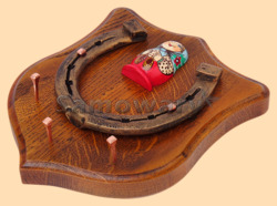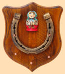 Размер медальона 19 на 22 см, с дополнительными подвесами чтобы вешать ключи (ключница) Медальон для подковы изготовлен из бука, покрашен под дуб и покрыт матовым лаком Размер подковы 13 на 13 см Подкова штампованная, покрыта патиной с медью По центру подковы размещена декоративная накладка в виде матрёшки с традиционным русским народным сюжетом Вес подковы - 850 гр. Производитель Россия
