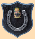 Каталог » Подковы на Счастье и Удачу » Подковы Остров Сокровищ в подарок иностранцу » Подкова Маша с петушком (цвет медальона венге, подкова патина с серебром)