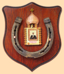 Размер медальона 19 на 22 см Медальон для подковы изготовлен из бука, покрашен под вишню и покрыт матовым лаком Размер подковы 13 на 13 см Подкова штампованная, покрыта патиной с медью По центру подковы размещена деревянная табличка размером 5 на 11 см с ликом святой Матроны Вес подковы - 850 гр. Производитель Россия