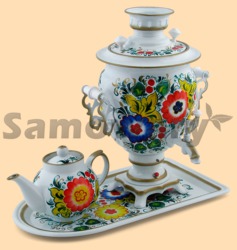 В комплекте заварочный чайник и поднос Самовар: - объем 3 литра - высота самовара 36 см - ширина самовара по ручки 28 см - на самоваре установлен терморегулятор, который отключает самовар при кипении - материал: латунь - расписан вручную, покрыт лаком - мощность ТЭНа 1 кВт, время закипания 18-20 минут - вес самовара 2,7 кг Чайник: - объем чайника 700 мл - материал: фарфор - расписан вручную, покрыт лаком - вес чайника 500 гр Поднос: - размер 31 на 41 см - вес подноса 400 гр - форма подноса может отличаться от фото, возможные формы подносов - круг (диаметр 35 см), овал (34 на 46 см), прямоугольник (30 на 40 см), арка (23 на 40 см), ключ (31 на 41 см), более подробную информацию вам предоставит менеджер Производитель Тула