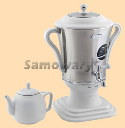 Дефект - самовар сам не отключается, его можно отключить только вынув из розетки Эстетичный самовар из нержавеющей стали с двумя ручками на 3.2 литра воды с фарфоровым чайником на 0.8 литра в комплекте. Режим поддержания температуры и повторного кипячения.