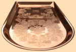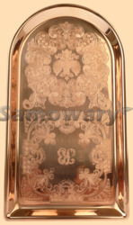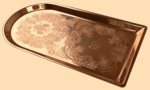 Размер подноса 16 на 29 см Материал полированная медь (красноватый цвет) На внутренней поверхности подноса нанесён узор методом холодной штамповки Вес латунного подноса 370 гр. Производитель Россия