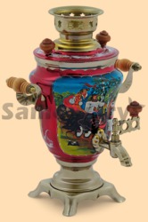 Самовар: - объем 1,5 литра - высота самовара 33 см - ширина самовара по ручки 24 см - материал: латунь - расписан вручную, покрыт лаком - мощность ТЭНа 1 кВт, время закипания 15 минут - вес самовара 2 кг - производитель Тула