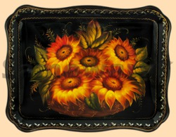 Каталог » Подносы Жостово » Подносы Жостово квадратные, прямоугольные » Поднос жостовский Корзина с Подсолнухами на чёрном (квадрат большой)